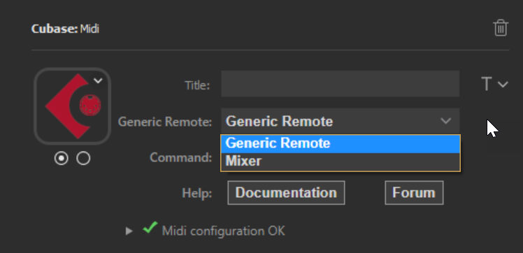 If two or more GenericRemoteName declarations are present, the action will display a dropdown where you can decide which remote device to access for that action. The commands available in the Commands dropdown will update to display the commands available in the selected Generic Remote device in Cubase.