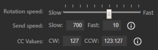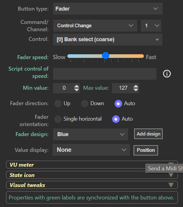 Fader, V-pot, and Scrub wheel buttons can be set up in a dual-button configuration. For faders, the display will extend to cover both buttons. V-pot and Scrub wheel buttons will have separate knob displays but will control different directions.