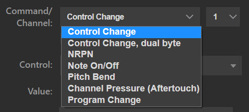 The control and value settings vary slightly depending on the MIDI command and display type.