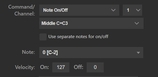 Set the values for "On" and "Off" commands. The default values are 127 for "On" and 0 for "Off," but you can modify them if your device or DAW requires different settings. If a single-byte command is selected, the maximum value is 127; for NRPN or a dual-byte command, the maximum value is 16,383.