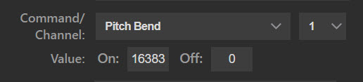 For MIDI command types that only send a value (Pitch Bend, Program Change, and Channel Pressure), the "Control" property is not available. For example, if you configure a Hold button to send Pitch Bend with On=16383 and Off=0, it will send a Pitch Bend 16383 message when you press the button and a Pitch Bend 0 message when you release it.