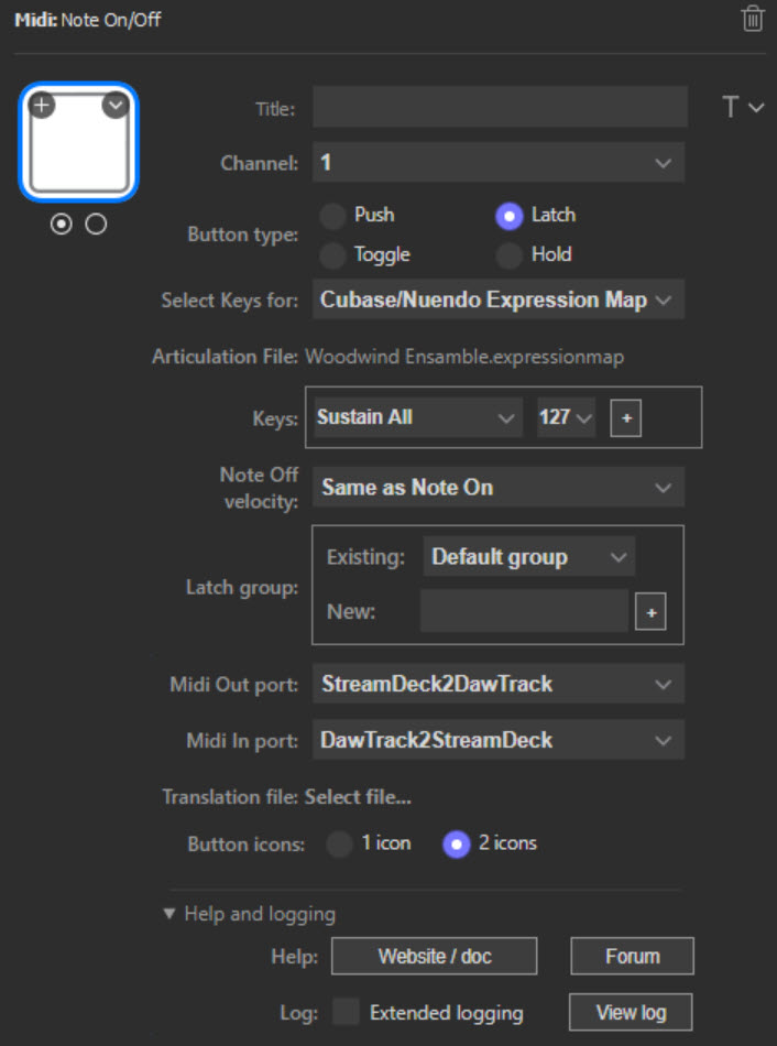 Select the Midi in port that should be used. By default, no midi in port is selected. Toggle and Latch buttons can monitor Midi In and adapt to and (if configured with two icons) show the current state based on incoming Midi messages. Any button type can be configured to use a translation file to define how incoming note messages should be treated. For Push and Hold buttons, incoming note messages are ignored if no translation file is defined.