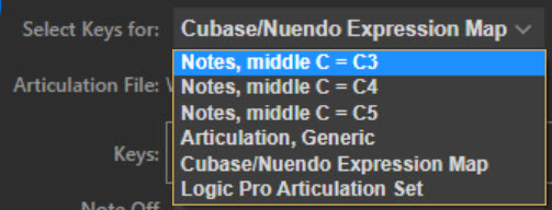 Cubase/Nuendo Expression Map | Select the expressionmap file used by the track in Cubase/Nuendo. The Expression Map file will be read, and the key dropdowns will be populated from the expression map instead of the standard key lists. |