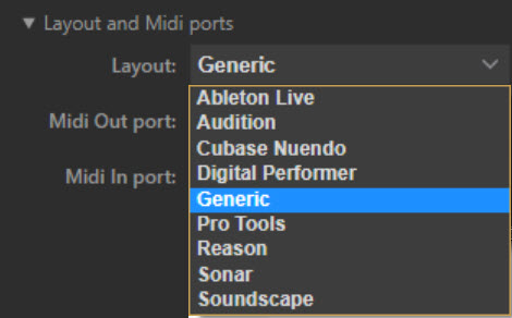 When the plugin is installed and the first button is created, you must select the layout you want to use (i.e., which daw you will control) and which midi ports to use. If needed, you can change these settings later, but assuming that these settings hardly ever change (i.e., you always connect to the same daw with the same midi ports), the settings are tucked away under the Layout and Midi ports arrow at the bottom of the editor area. From this point on, these settings are used whenever a new button is created. (Please see the end of this page for more details on layouts and midi ports)
