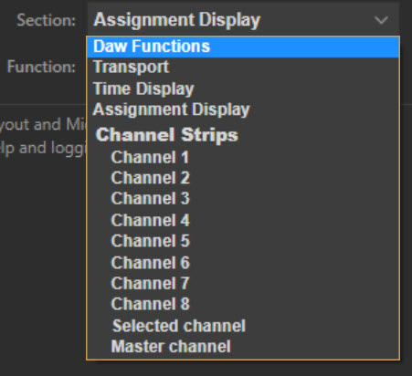 Select which section of the Mackie Control you want the button to interact with. The selected section will control which functions will be available in the Functions menu.