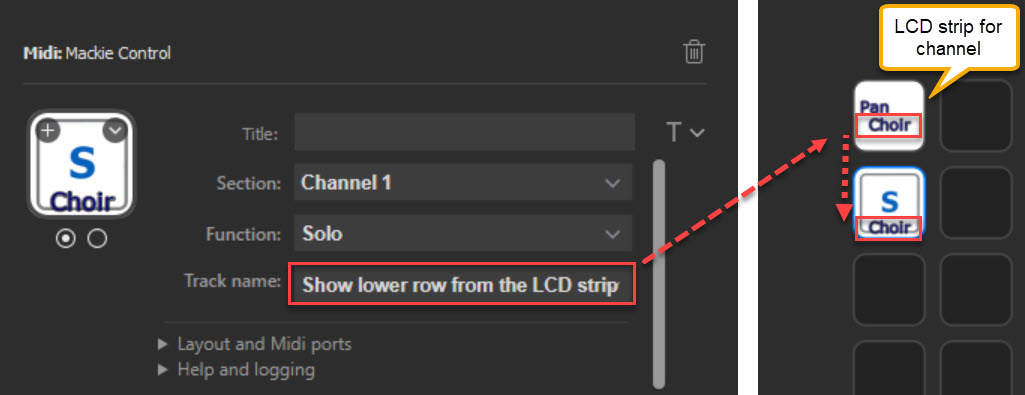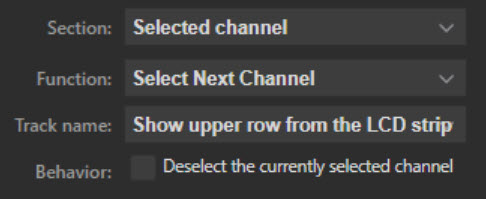 Track names can be displayed in the upper or the lower row on the LCD strip...or not at all. Due to size restrictions on the LCD strip, the DAW will display a 6-character abbreviation of the actual track name. (You do not need to have a button defined for the LCD strip itself - the plugin keeps track :-) of the LCD strip content in the background.)