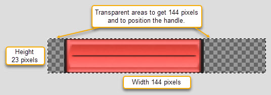 They must be exactly 144 pixels wide or high. The size of the handle image determines the orientation of the fader; if it is 144 pixels wide, a vertical fader is created; if it is 144 pixels high, a horizontal fader is created.
