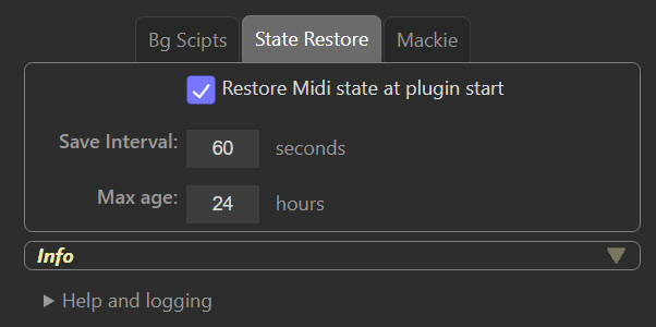 Max age defines the maximum age of Midi commands to restore when the plugin starts. The default value of 24 hours means that commands made more than a day ago will not be restored. The idea is that commands issued long ago may not be relevant when the plugin starts and are hence not restored.