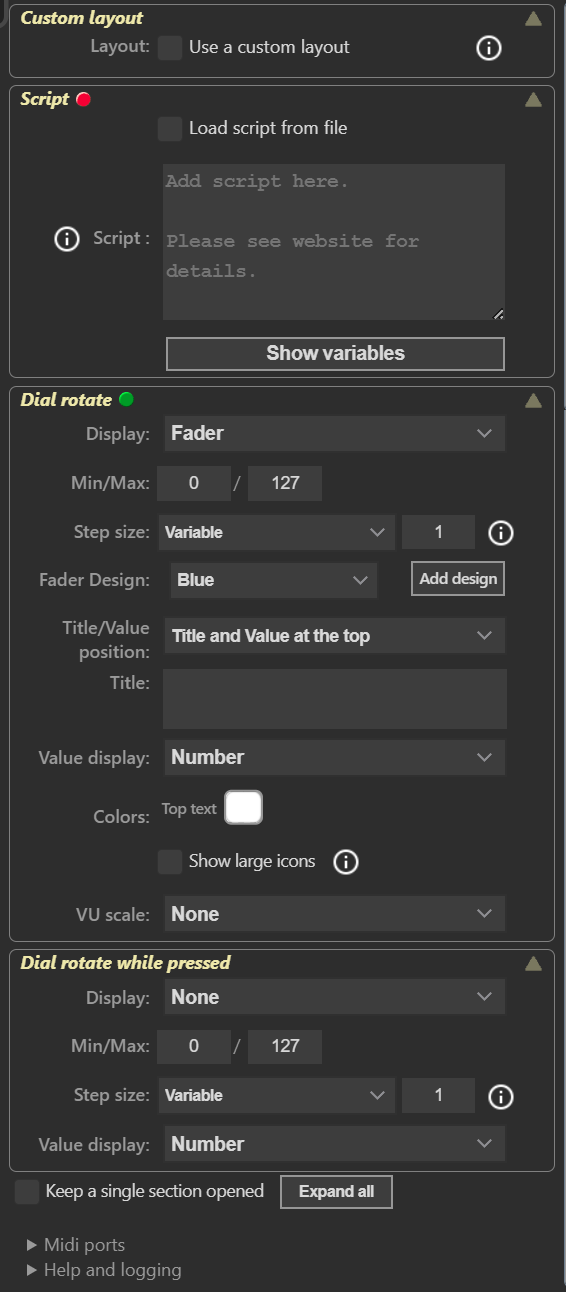 The configuration parameters in the editor are the same as for the Generic Midi dial; please see that page for parameter descriptions. The script language has actions that can change almost all configuration parameters, and if used, they will alter the setting in the editor. You can configure all parameters in the editor, set all parameters in the script, or do anything in between.