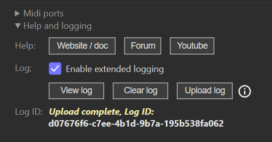 - The Upload button sends both the plugin log file and the Stream Deck log file to the Trevliga Spel server. An ID is assigned to each upload, which is displayed below the buttons. If you have uploaded files previously, the ID from the last upload will appear in the Log ID field.