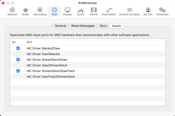 In the "All Midi Inputs" column, remove all (Stream Deck related) ports except the StreamDeck2DawTrack port; it's the only port with the purpose of reaching tracks. Other ports can be selected as input for a track, but you must explicitly select them; they will not accidentally be selected as part of "All Midi Inputs."