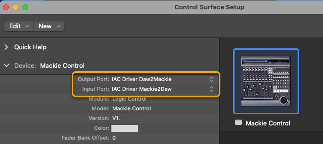 For remote control using the Mackie Control protocol, configure the port names dedicated to Mackie Control. When adding a device for Mackie Control, select "Mackie Control", not anything with "HUI" in the name.