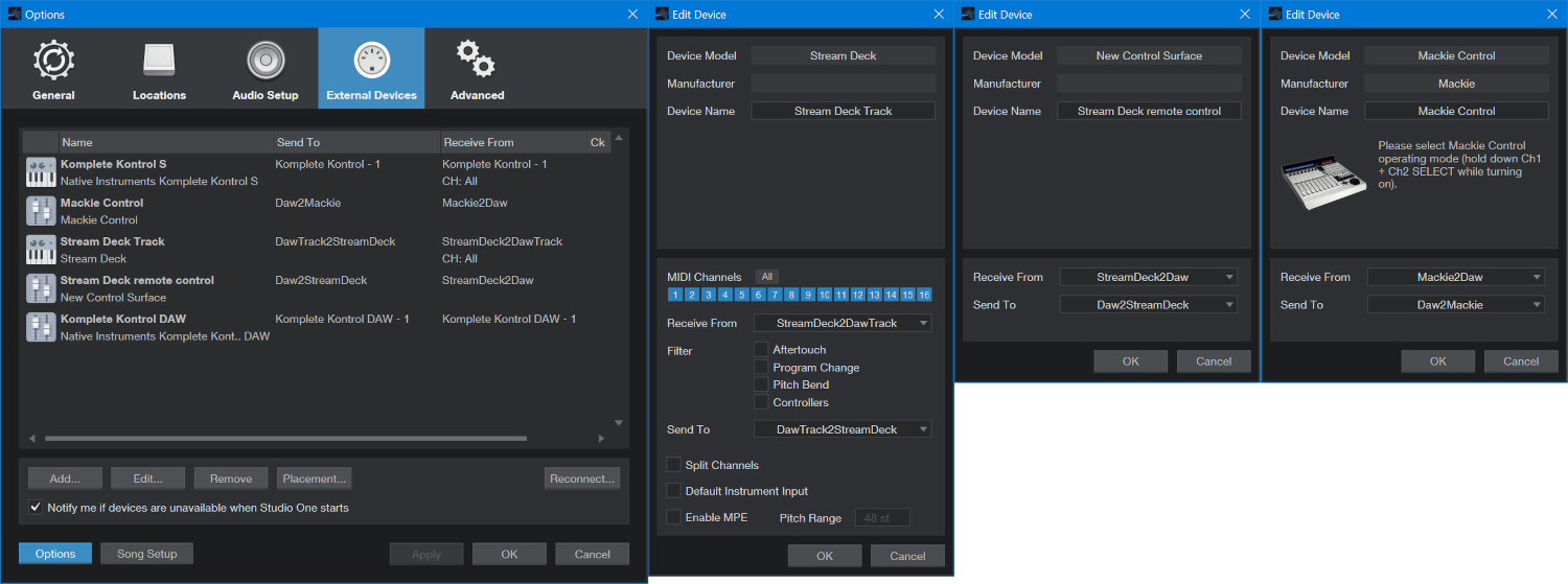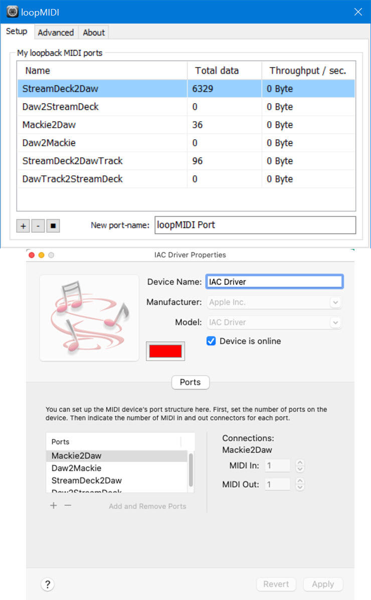 Third: If you are using Mackie Control actions, these must have separate midi ports that are not used by anything else (than the target daw, of course). If you also use other Midi actions on Stream Deck, these must use other midi ports. If you have other devices using the Mackie Control protocol, they must have their own set of midi ports. Having multiple devices share the same Mackie Control midi ports will most certainly cause hard-to-diagnose erroneous behaviors.