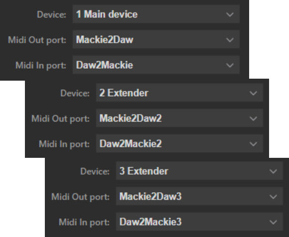 Tip: Active Mackie devices (i.e., with defined MIDI ports) will attempt to connect to the MIDI ports, monitor incoming messages, and track the status of all buttons, faders, pots, and LCDs for that device. This uses system resources on your computer; it's negligible but still unnecessary if not needed. If you have defined a Mackie device in the plugin that is no longer required, you can disable it by selecting "No MIDI Input/No MIDI Output" for that device.