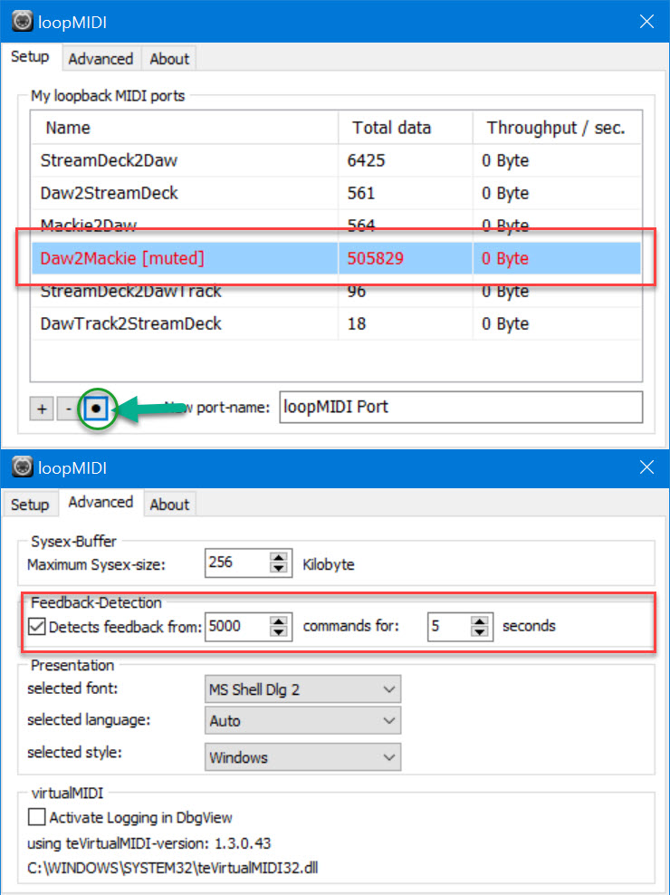 When this occurs, the port becomes muted and displays in red text in loopMidi. You can unmute the port by clicking the indicated button (with the port selected).
