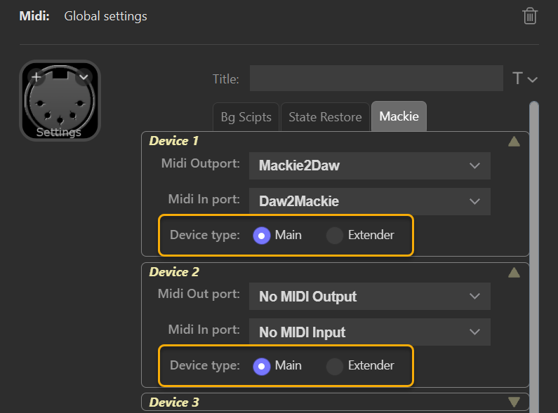 To change the device order in the plugin, open the Mackie tab in a Global Settings button. The Mackie devices can be rearranged by drag-and-drop; click and hold a section header for a Mackie device, then drag and drop it to the desired location.