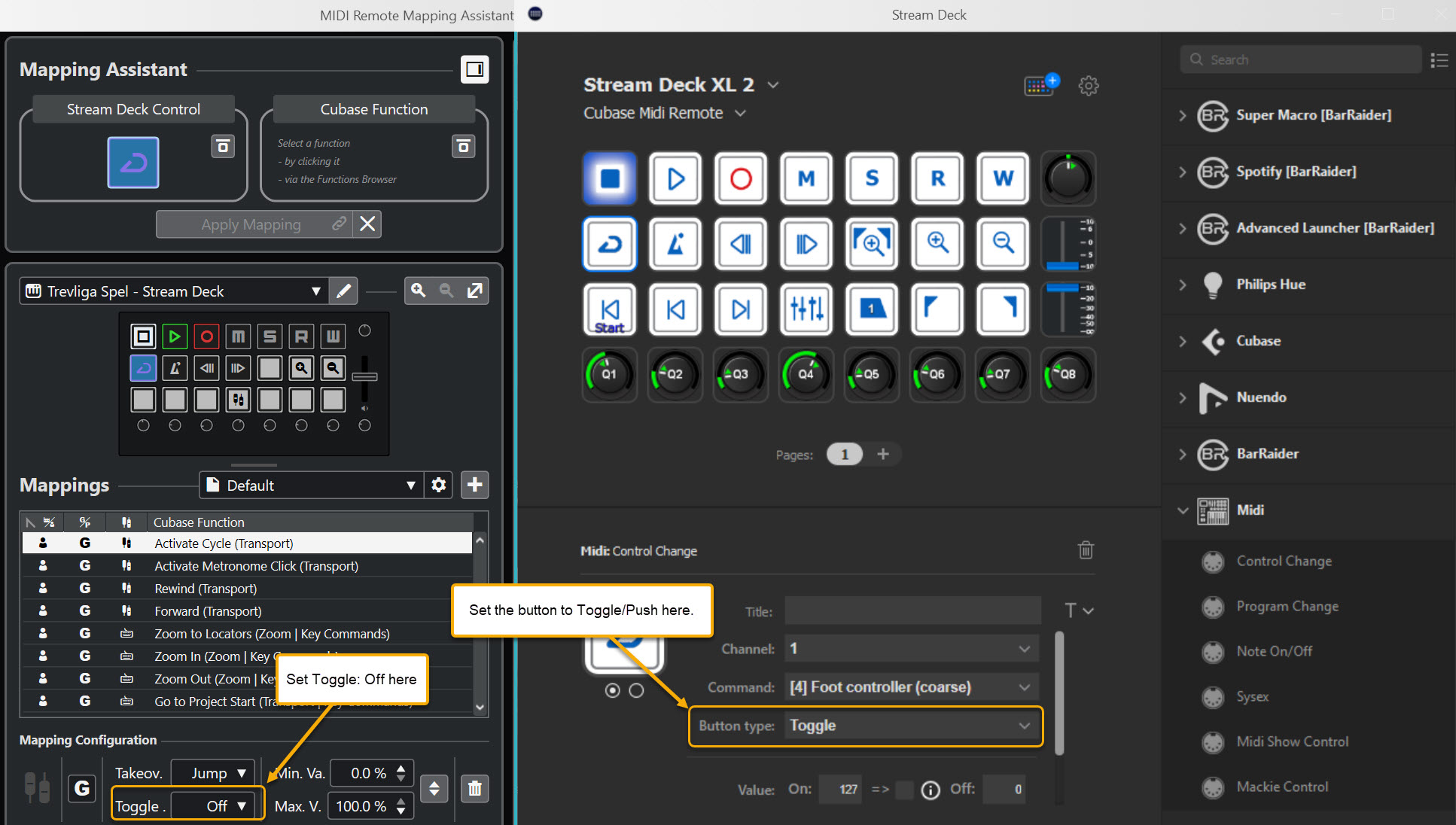Contrary to when you are using the Generic Remote in Cubase, you need to configure the Stream Deck profile first, and then create buttons in the MIDI Remote and learn the commands used by the Stream Deck buttons. The button types in the MIDI Remote map very well to the button types in the plugin (button/knob/fader)